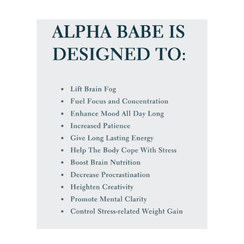 Alpha Babe was specifically designed to Enhance Cognition, Clear Brain Fog, Protect Brain from Aging & Free Radicals, Boost Brain Power, Improve Memory & Focus, Combat Stress & Reduce Anxiety & to be a Non-Stimulant Source of Clear Sustained Energy. Unleash Your Alpha Babe.