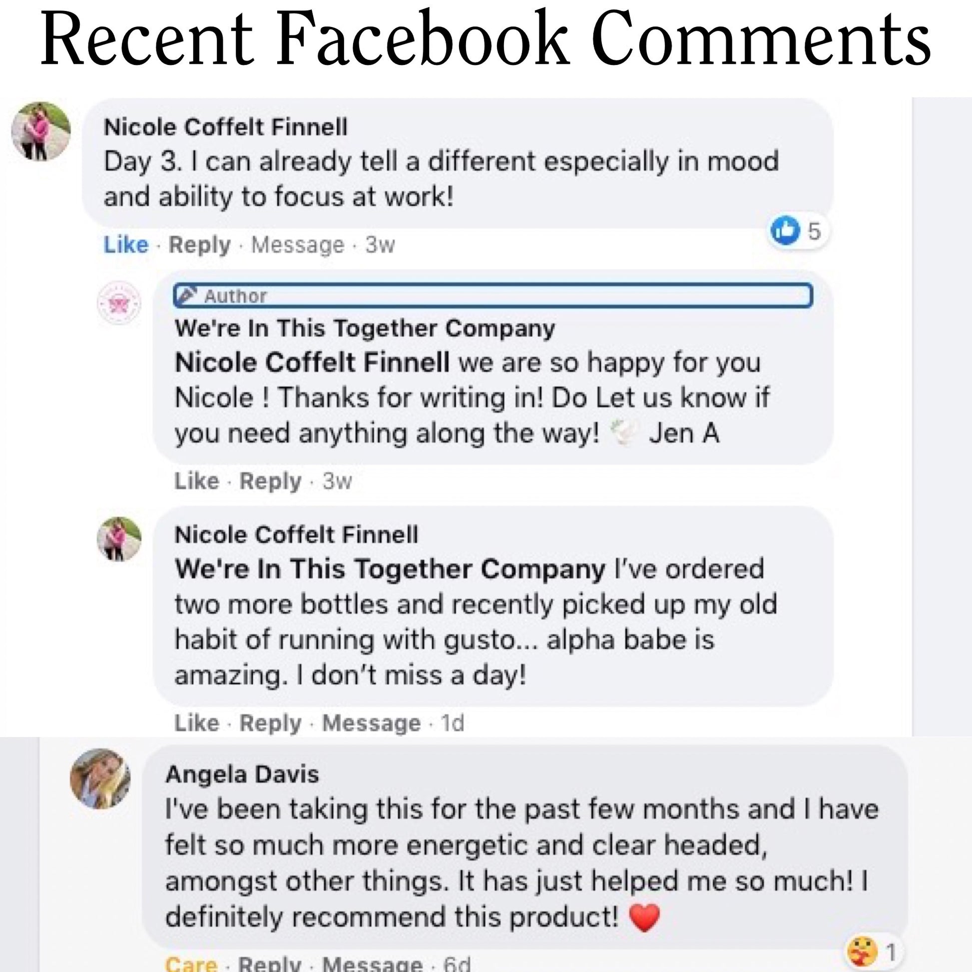 "I've been taking Alpha Babe for about 2 months now and can't imagine life without it!! I noticed the effects from day one. I feel more energized and less irritable. Great first thing in the morning and before long hikes and workouts. Makes working from home more productive!"